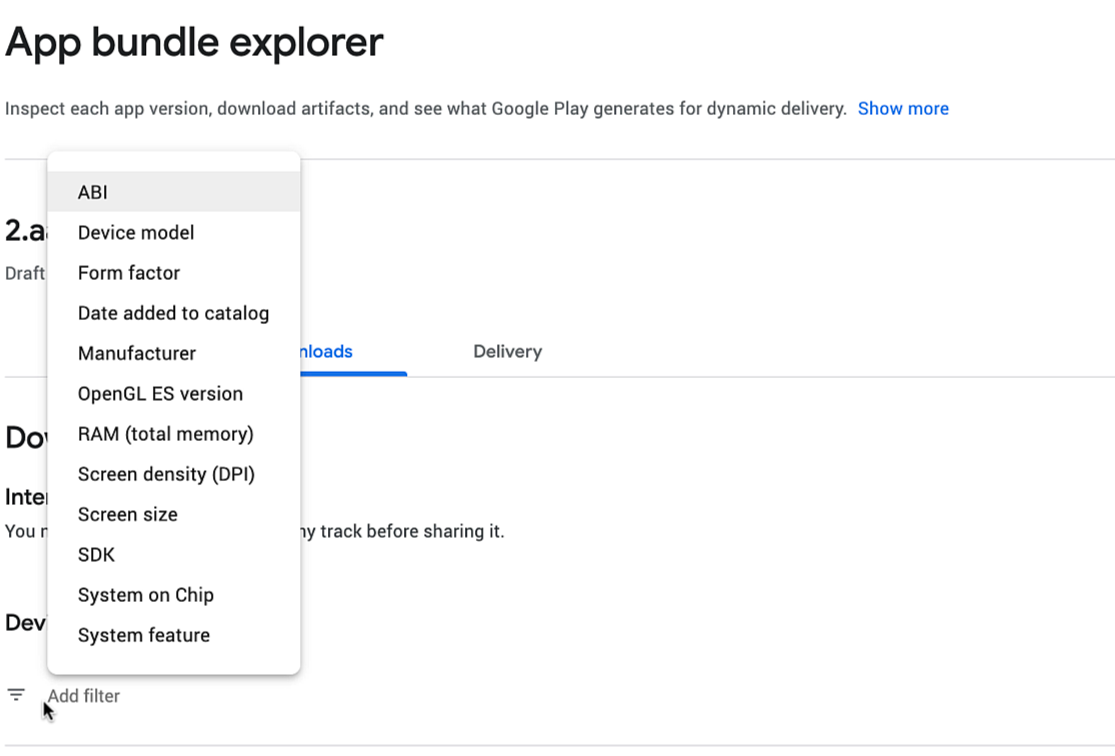 And you also can download signed APKs for your app, to see exactly what the Play Store delivers to a specific device. To navigate there, click on "Explore Bundle" and then open the "Downloads" tab.